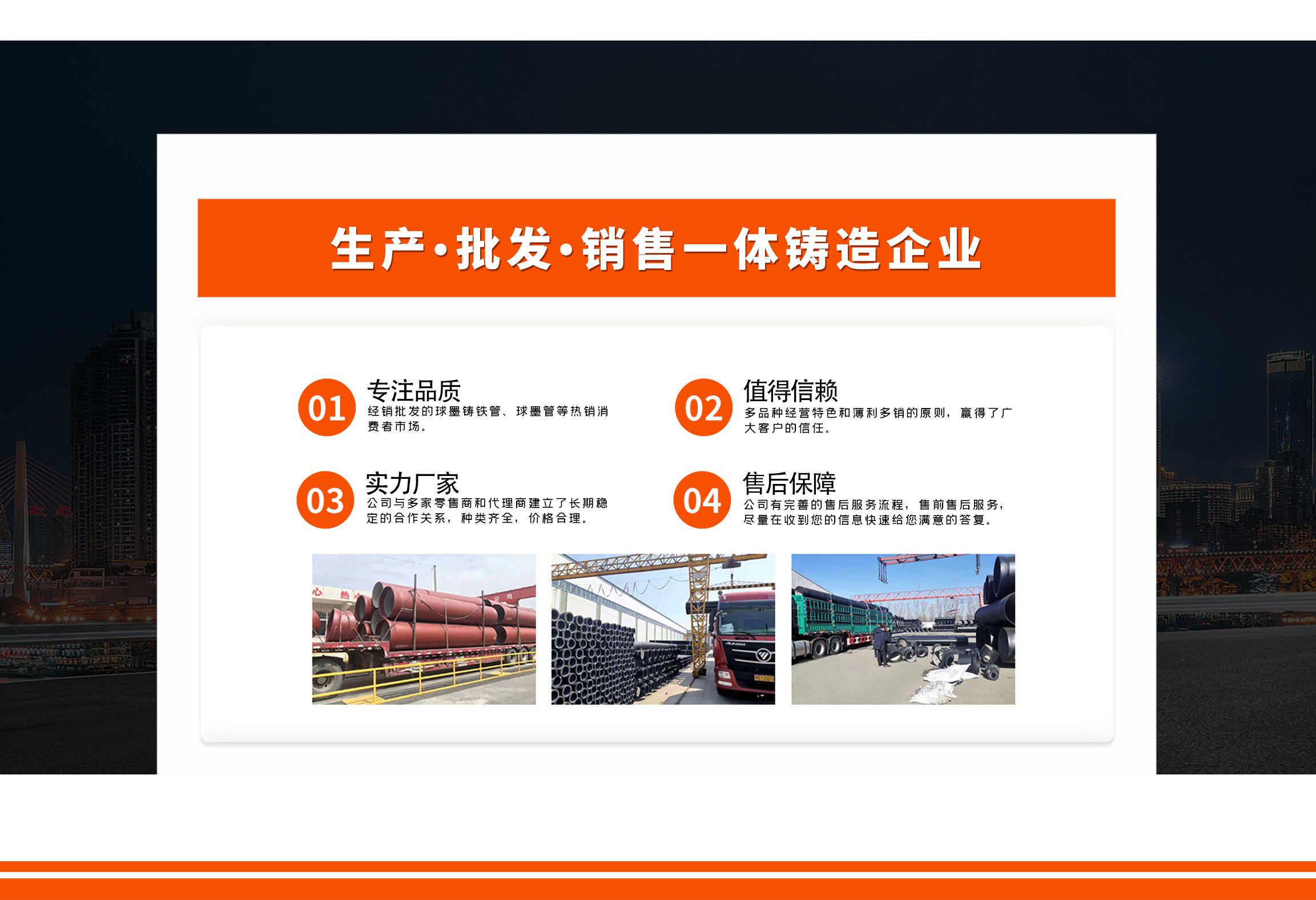 青島金源達管業有限公司主要經營各種規格球墨鑄鐵管,球墨管,球墨鑄鐵管廠家等產品,質量可靠,誠信經營,值得信賴! 青島金源達管業有限公司始終堅持“誠信立業,追求卓越,合作共贏,共同發展”,竭誠歡迎各界朋友來廠參觀指導,洽談業務。我們愿與您攜手共進,互惠雙贏,共創未來! 公司堅持“以奮斗者為本”的理念,關心關愛職工,職工的獲得感、幸福感更加充實、更有保障、更可持續;秉承“忠誠企業、勇于擔當、開拓創新、主動作為”,堅持黨建領航、創新驅動、文化塑魂、奉獻社會,全面致力于綠色、低碳、高效、高質量發展。 愿與各界朋友攜手并進,共創未來!...
